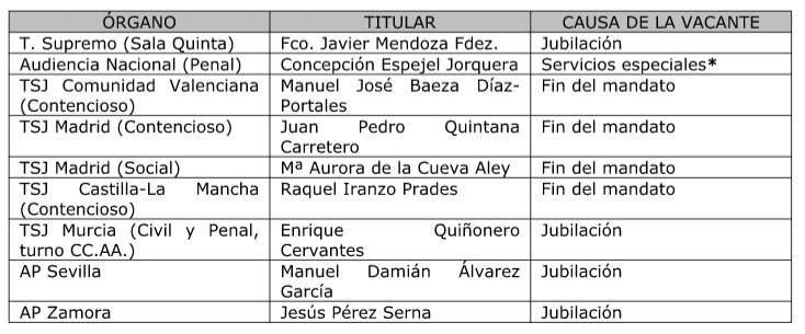 En la Sala Cuarta hay tres vacantes por el fallecimiento de José Manuel López García de la Serrana, la jubilación de Jesús Gullón Rodríguez y la situación de servicios especiales de Lourdes Arastey Sahún, y en la Sala Quinta hay una por la jubilación de Ángel Calderón Cerezo.