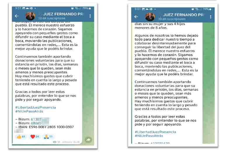 Pero es que desde X se remite a una cuenta en otra red social, Telegram, que cuenta con 10.656 suscriptores, desde la que solicita aportaciones económicas en un número de cuenta española y dos números de teléfonos móviles para que se les haga ingresos mediante Bizum.