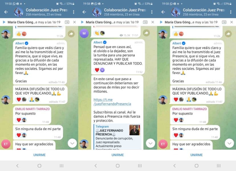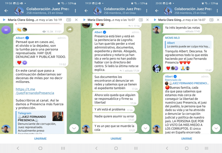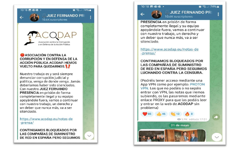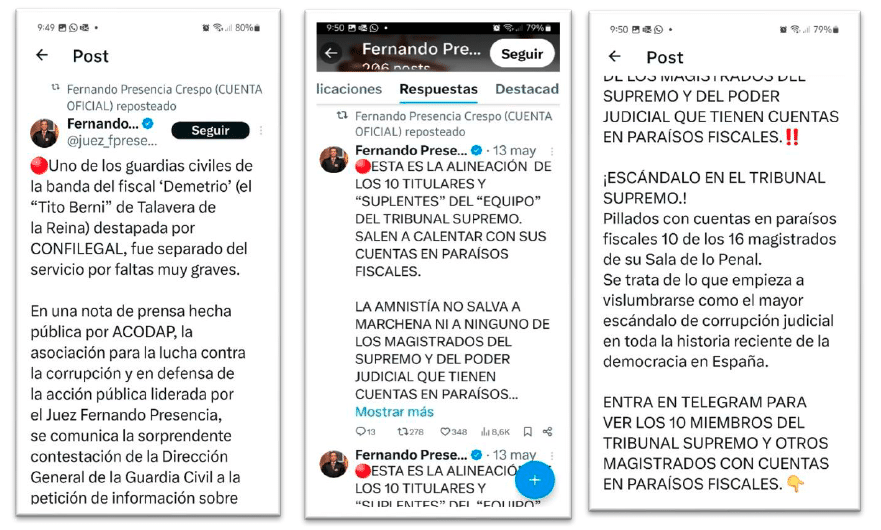 No solo de la captación de fondos. También de la gestión de las redes sociales, tanto en X (antes Twitter), desde la cual solicita aportaciones económicas, como en Telegram, en las que Presencia Crespo aparece como titular. Así como de su cuenta oficial de gmail, desde la que despliega una campaña continua en apoyo del exjuez. Y de ACODAP.