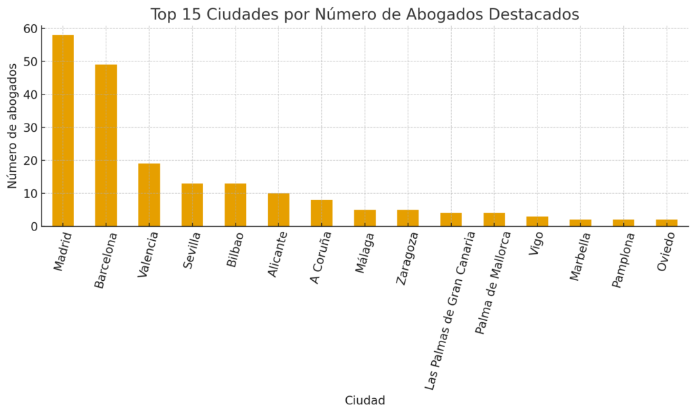 El análisis geográfico, por otra parte, confirma la concentración del talento jurídico en 20 ciudades del país. Madrid lidera la clasificación con 58 abogados destacados, seguida de Barcelona, que suma 49.