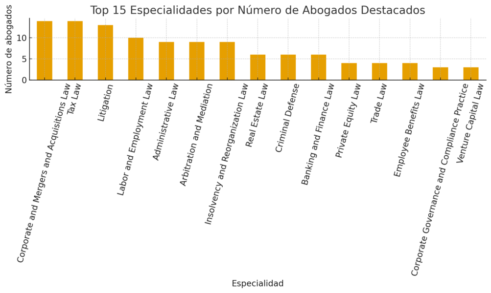 El análisis por áreas de práctica permite identificar las necesidades jurídicas predominantes. La especialidad con mayor número de abogados destacados es Corporate and Mergers and Acquisitions Law, lo que subraya el dinamismo empresarial y el peso de las operaciones corporativas en España.