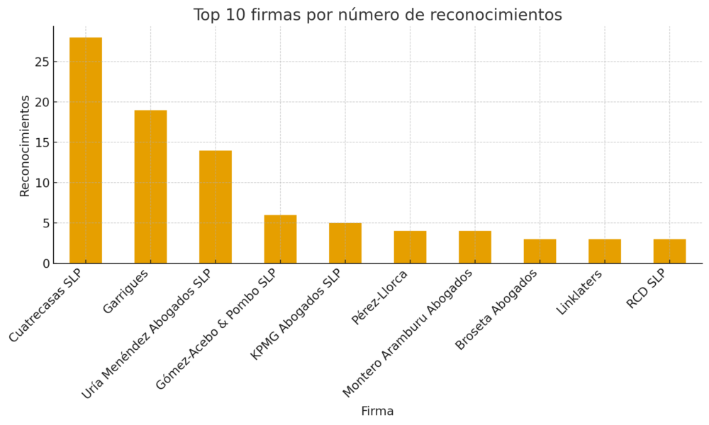 Después, firmas como Gómez-Acebo & Pombo, Pérez-Llorca o Montero Aramburu, con 4; conforman un segundo nivel de firmas que, aunque más reducido en volumen, mantienen un papel decisivo en áreas clave del sector jurídico español.