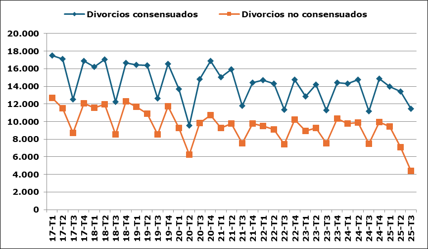 Por el contrario, las demandas consensuadas mostraron una evolución desigual. Las de divorcio consensuado alcanzaron las 11.437, con un incremento del 2,2 %, mientras que las de separación consensuada, que fueron 432, disminuyeron un 8,9 %. En cuanto a las nulidades matrimoniales, entre julio y septiembre se presentaron 11 demandas, una menos que en el tercer trimestre de 2024.