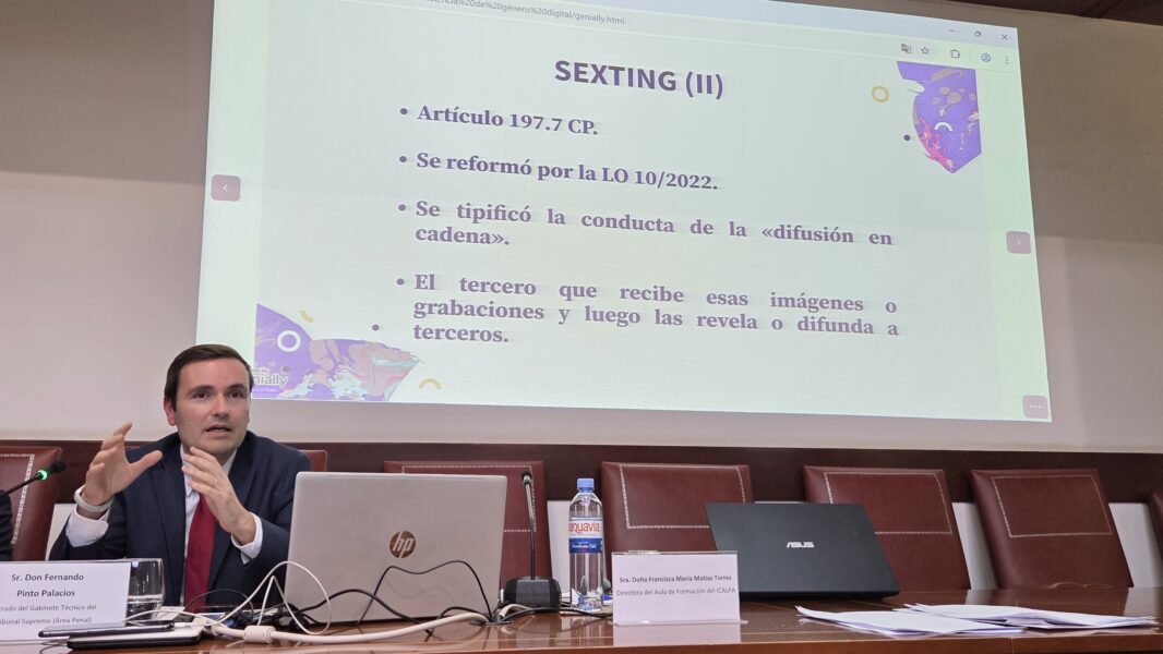 Junto al acoso, Pinto Palacios abordó otra de las manifestaciones más lesivas de la violencia de género en la red: el «sexting», la difusión no consentida de imágenes, vídeos o mensajes de contenido íntimo o sexual.