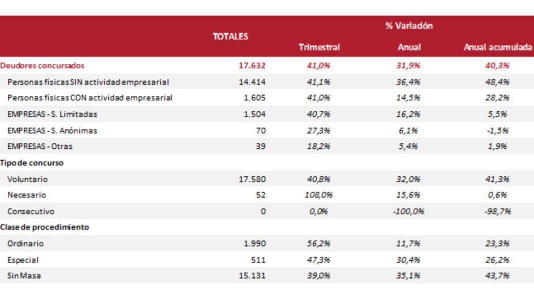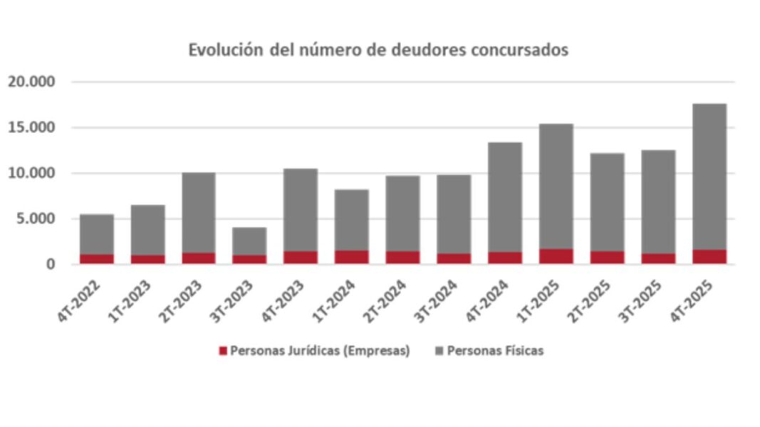 Durante el cuarto trimestre de 2025 se registraron 17.632 deudores concursados, lo que supone un crecimiento del 41% respecto al trimestre anterior y un aumento interanual del 31,9%. Este repunte consolida una tendencia claramente alcista en el conjunto del ejercicio y refuerza el cambio estructural del sistema concursal tras la reforma operada por la Ley 16/2022.