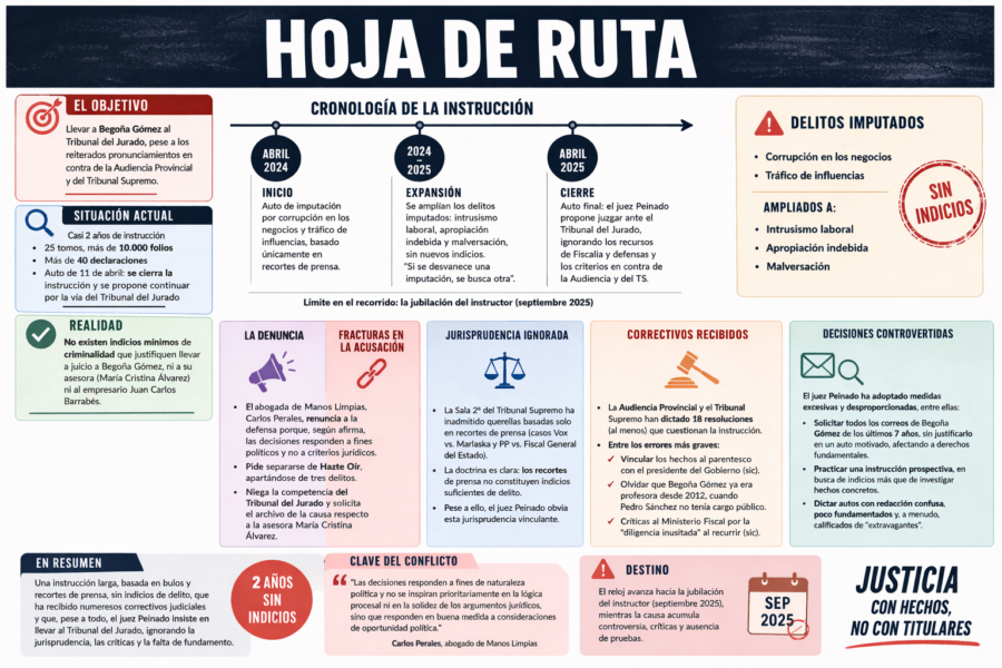 Han transcurrido casi dos años, desde la incoación por el magistrado Peinado de las diligencias previas 1146/2024 contra Begoña Gómez, sin que hasta la fecha se hayan podido aportar a la causa, unos mínimos indicios de criminalidad que permitan llevar a juicio a la esposa del presidente del gobierno, como tampoco a la asistente María Cristina Alvarez y al empresario Juan Carlos Barrabés.