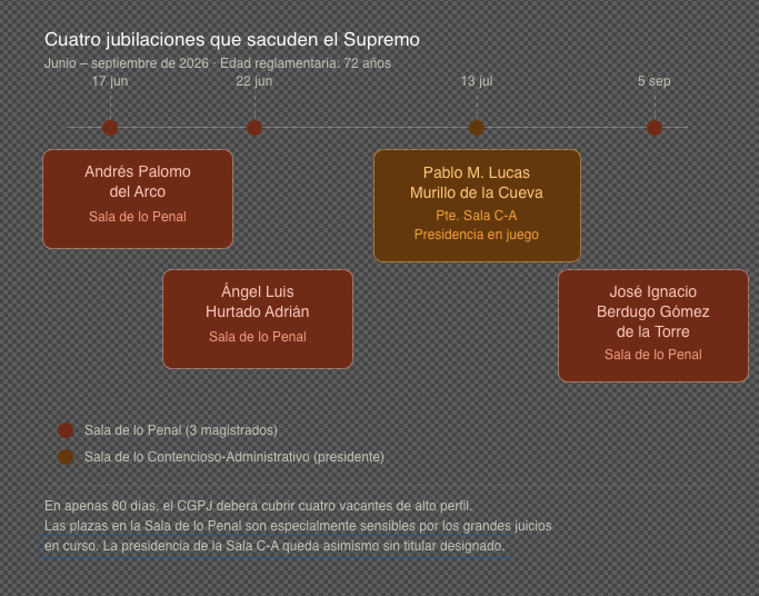 El Tribunal Supremo se asoma a un verano de transición acelerada. Entre el 17 de junio y el 5 de septiembre de 2026, cuatro magistrados alcanzarán la edad reglamentaria de jubilación —72 años— dejando vacantes que el Consejo General del Poder Judicial (CGPJ) deberá cubrir con urgencia y con el foco mediático encima.